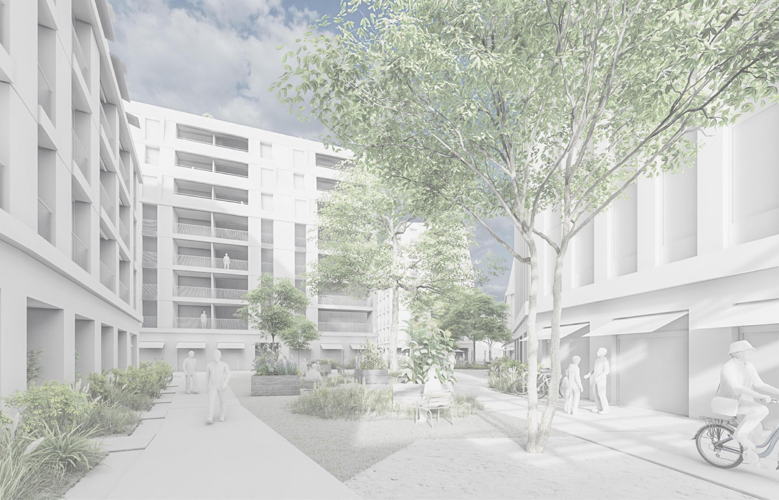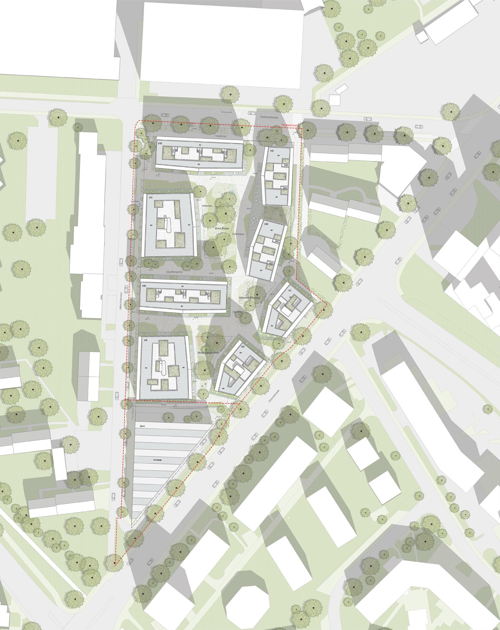 spezifischen Qualitäten aus: Die Innenhöfe sind üppig mit Bäumen bepflanzt, die Flächen vor den Gebäuden fungieren als Pufferzone zwischen öffentlichem und privatem Raum und die autofreien Strassen sind deutlich als solche zu erkennen. Aufgrund ihrer natürlichen Bepflanzung und Beschattung dienen diese Flächen auch als Rückhaltefläche für überschüssiges Regenwasser, als Kühlmassnahme und als eigenes Mikroklima.