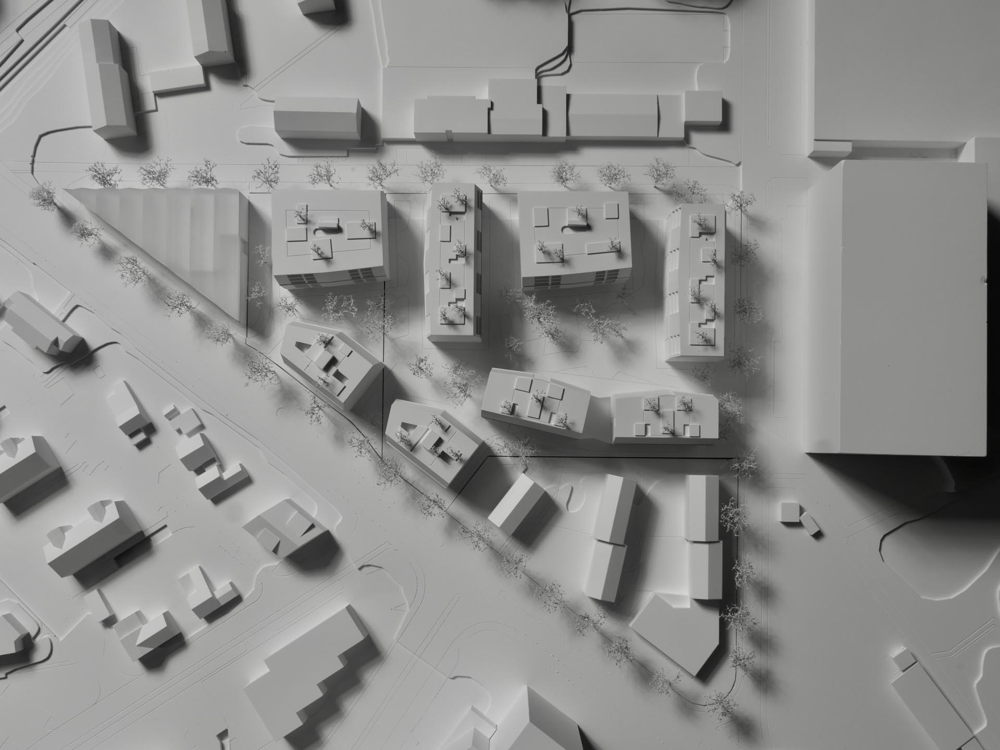 Das neue Quartier wird durch vier verschiedene Typologien geprägt: das Atriumhaus, das Zeilenhaus, das Punkthaus und das Zwillingshaus. Jede Typologie wird zweimal eingesetzt, wodurch Paare entstehen, die aufgrund ihrer Anordnung und Ausrichtung im Plan miteinander zu ‹tanzen› scheinen. Die Begrenzung der Anzahl der Gebäude- und Wohnungstypologien diente sowohl der Kohärenz als auch der Optimierung und schuf ein ausgewogenes Gleichgewicht zwischen Wiederholung und Vielfalt. «Wir haben uns vom Walzer, einem Tanz für zwei Personen in geschlossener Haltung mit schnellen Drehungen und festem Schrittmuster, inspirieren lassen», erklärt Ute Schneider, Partnerin bei KCAP.