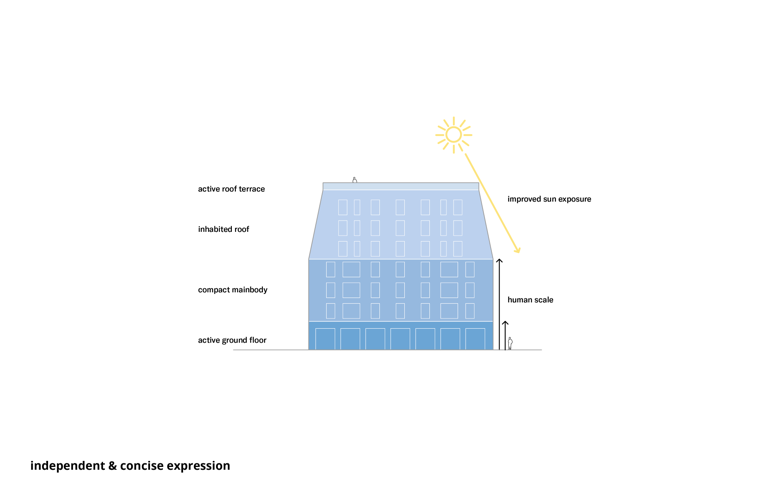 Allen vier Typologien gemeinsam ist ein schräges Dach, das die drei obersten Stockwerke einschliesst und eine Traufe über dem vierten oder fünften Stockwerk bildet. Dadurch wird ein menschlicher Massstab eingeführt und viel natürliches Licht für die öffentlichen Räume und Wohnungen gewährleistet. Zusammen mit der unterschiedlichen Materialisierung des Erdgeschosses sind die Fassaden visuell in drei Schichten gegliedert: Erdgeschoss, Körper und Schrägdach.