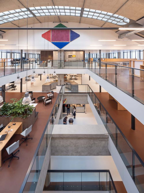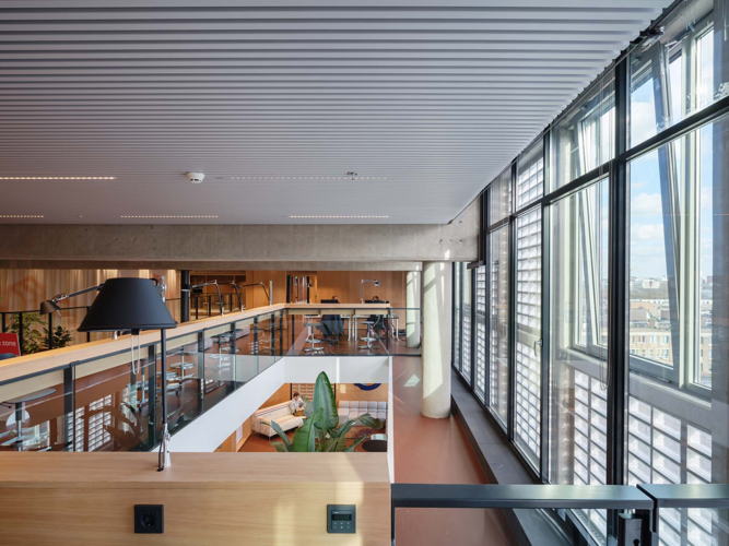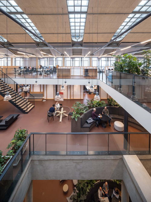 The glass block windows, combined with skylights, originally provided the building with ample light. However, due to the depth of the floors, this proved insufficient for a modern office environment. To increase the amount of daylight on the lower floors, KCAP inserted vides throughout the building. These staggered vides, at times wide and at times narrow, create a lively interplay between single-height and double-height floors, resulting in an impressive atrium that opens up the building and makes people ‘see and be seen’ - the new office's vibrant heart.