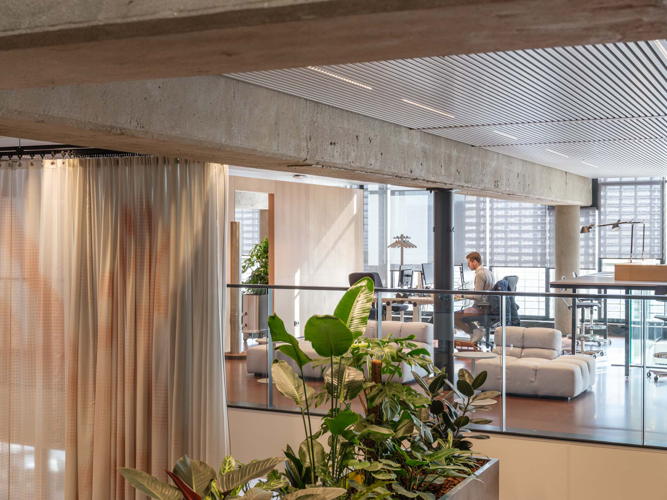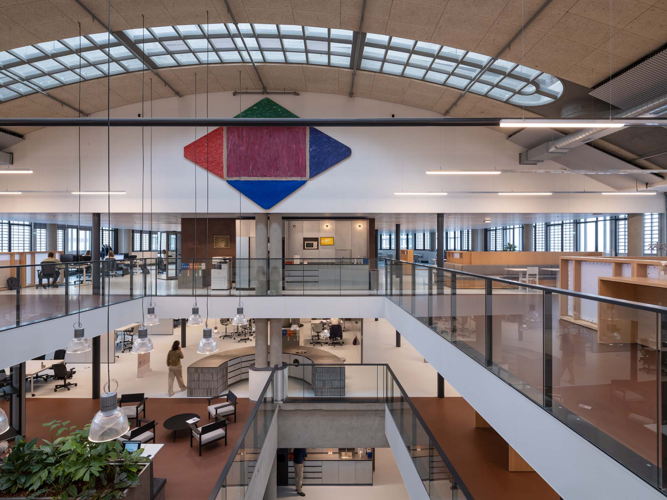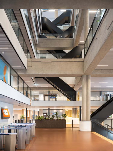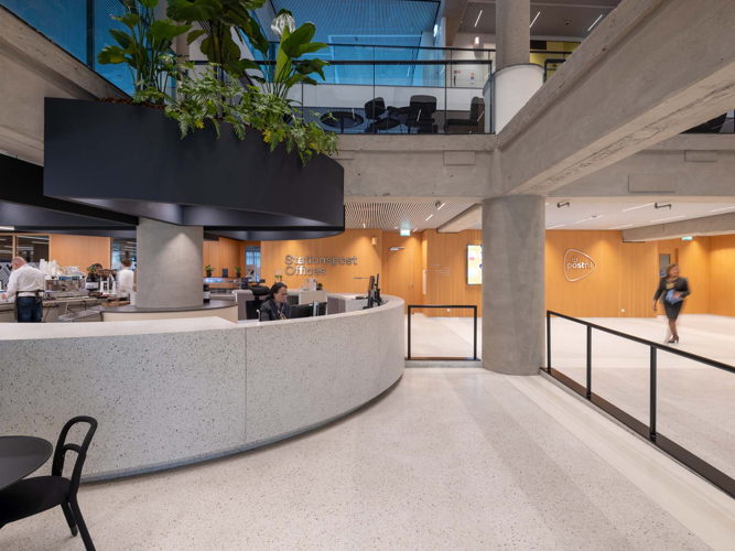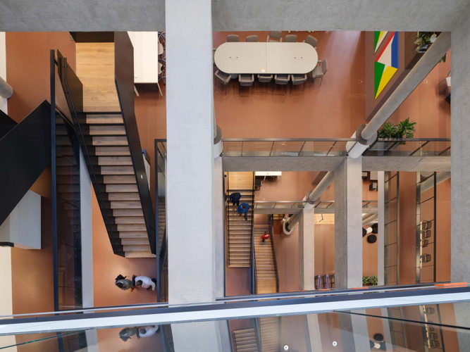 The interior design by Kraaijvanger Architects responds to PostNL's need for this new way of working, focussing on flexible collaboration, versatile use and employee well-being. “The spatial layout and atmosphere of the monumental building are unique: the glass blocks facade, the deep floor areas and the powerful structural features. Together with KCAP's bold intervention to open up the concrete floors, these qualities have been leading in the mapping of the interior’s different areas”, says Chantal Vos, associate partner at Kraaijvanger Architects.