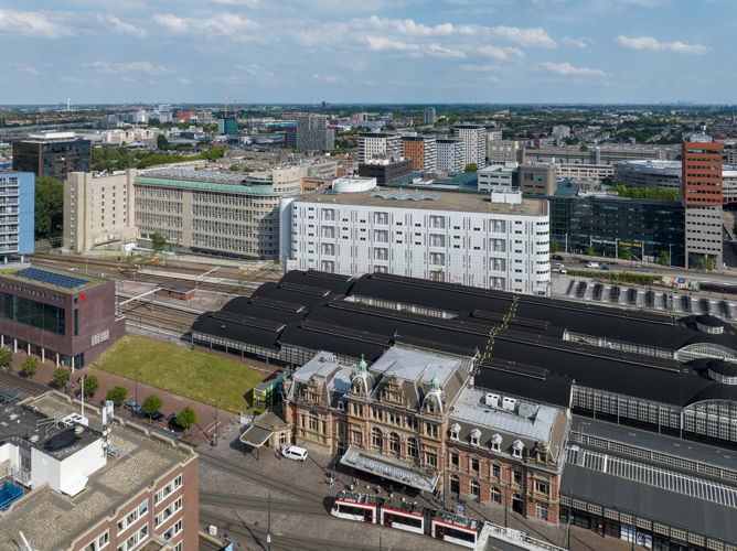 The Stationspostgebouw, designed in 1939 by Chief Government Architect G.C. Bremer, is of great historical, architectural and urban importance. The 30.000 m2 building, regarded as a textbook example of Functionalism, was one of the most modern postal sorting centres in the Netherlands on completion. It stands out for its distinctive pale brick facade with curved forms and glass block windows, which conceals high but deep floor areas. Conceived as the most prominent building along the rail, it has always been a landmark for and within the city of The Hague.