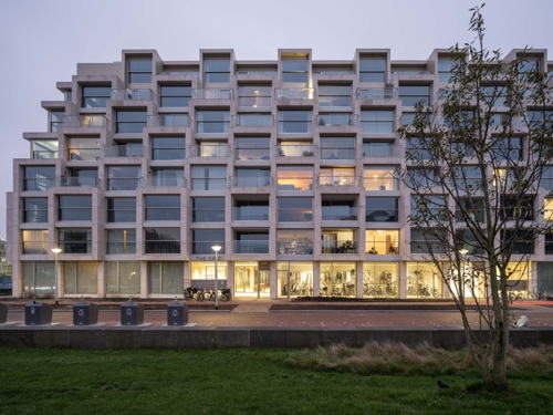 Rotterdam, 7 December 2021—KCAP has completed the housing block The Grid in the new residential neighbourhood along the river IJ in Amsterdam North, facing the Central Station. The project is part of the transformation of the former industrial site Overhoeks into a diverse district for living and working. Within the development of the district Aan het IJ, The Grid presents itself as an all-sided, stacked living world with 68 spacious apartments around an interior green courtyard. KCAP designed The Grid in commission of Amvest, Amsterdam.