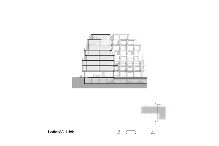 "The Grid appears as a building made of balconies", says Irma van Oort, architect and partner of KCAP. "Each unit of The Grid has at least one balcony, depending on the size of the dwelling. In this way, the actual living space is extended outwards and enters a dialogue with its surroundings." Storey-high, wide sliding windows allow for the creation of additional loggias. The terraces provide plenty of light inside and also enhance the spatial appearance of The Grid. Thanks to the way the terraces are stacked, all outdoor spaces enjoy sufficient privacy; a special integrated rainwater drainage system in the construction takes account of the stepped shape of the terraces. Planting on the balconies in combination with the green courtyard designed by Buro Sant en Co will ensure that The Grid becomes increasingly green over the years.