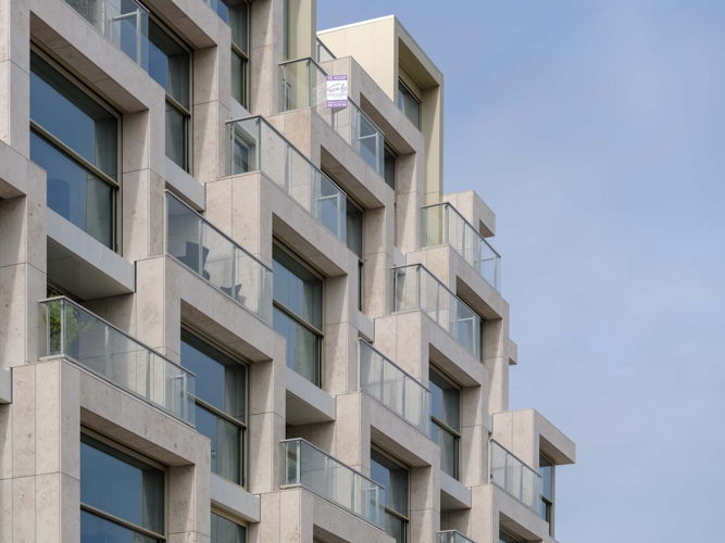 The name 'The Grid' refers to the importance of the grid for the design and the appearance of the building. With balconies opening on every side, The Grid has no actual front or back, defining a new type of residence. The grid of the stacked terraces is enriched by a striking material mix, consisting of a façade clad in natural stone from the Jura region combined with floor-to-ceiling glas. On the top, a light-gloss, brass-coloured anodised aluminium crown completes the building and creates an elegant and luxurious expression. The diverse material palette, which includes both smooth and rough surfaces, allows The Grid to change its character according to the light and weather conditions, while creating a consistently appealing living environment.