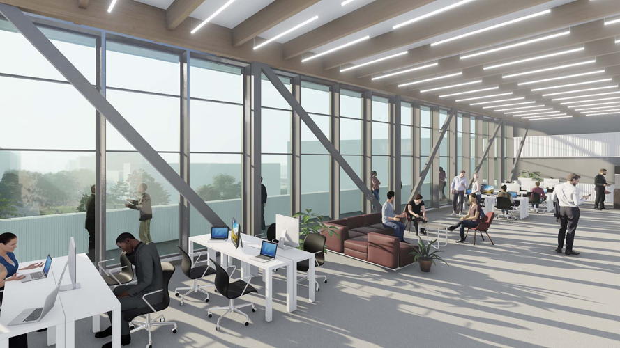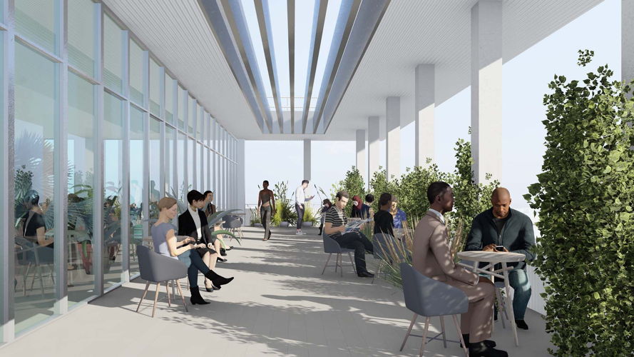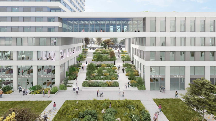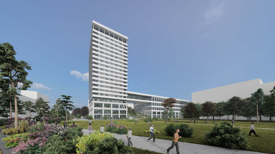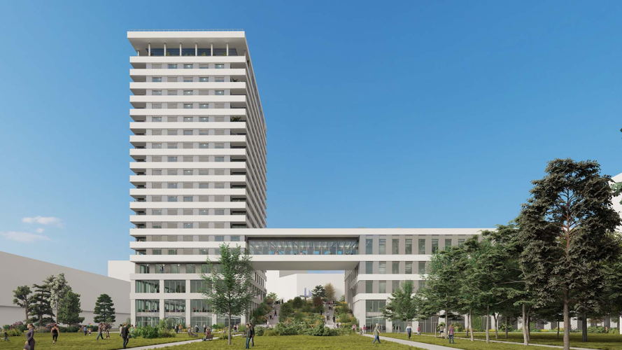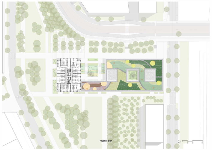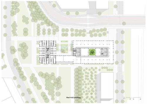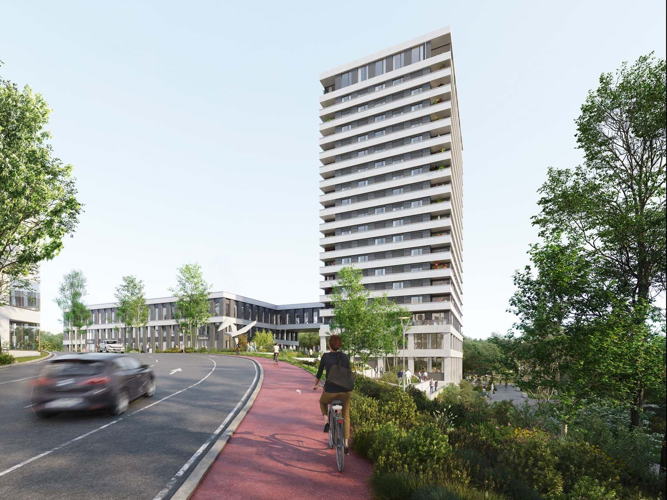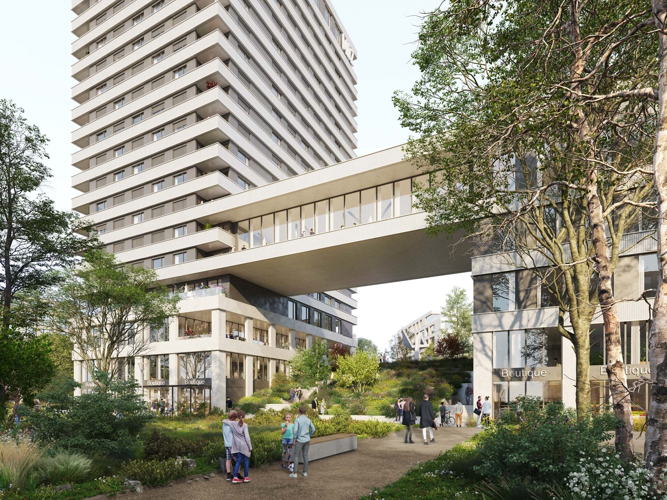 Uitdaging was daarbij om een architectonisch statement te maken dat monumentaal is maar ook duurzaam, dat ingebed is in de stad én dat goed functioneert als gebouw. Het programma in de toren bestaat uit appartementen, de kantoren en co-working spaces bevinden zich in de laagbouw en de luchtbrug. Voor de co-working spaces ontwierp KCAP een aantrekkelijke, grote en open kantoorruimte met een loggia met prachtig uitzicht op het lineaire bos, om daarmee de unieke locatie zo goed mogelijk te benutten De co-living appartementen - compacte woonruimtes voor jonge professionals, onderzoekers en starters - delen samen een dakterras dat uitkijkt over de wijk en het stadscentrum. “Zo hebben alle gebruikers én een royale buitenruimte én een geweldig uitzicht,” legt Xavier Blaringhem, partner bij KCAP, uit.