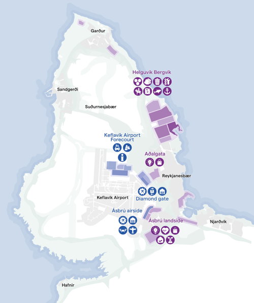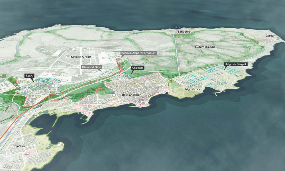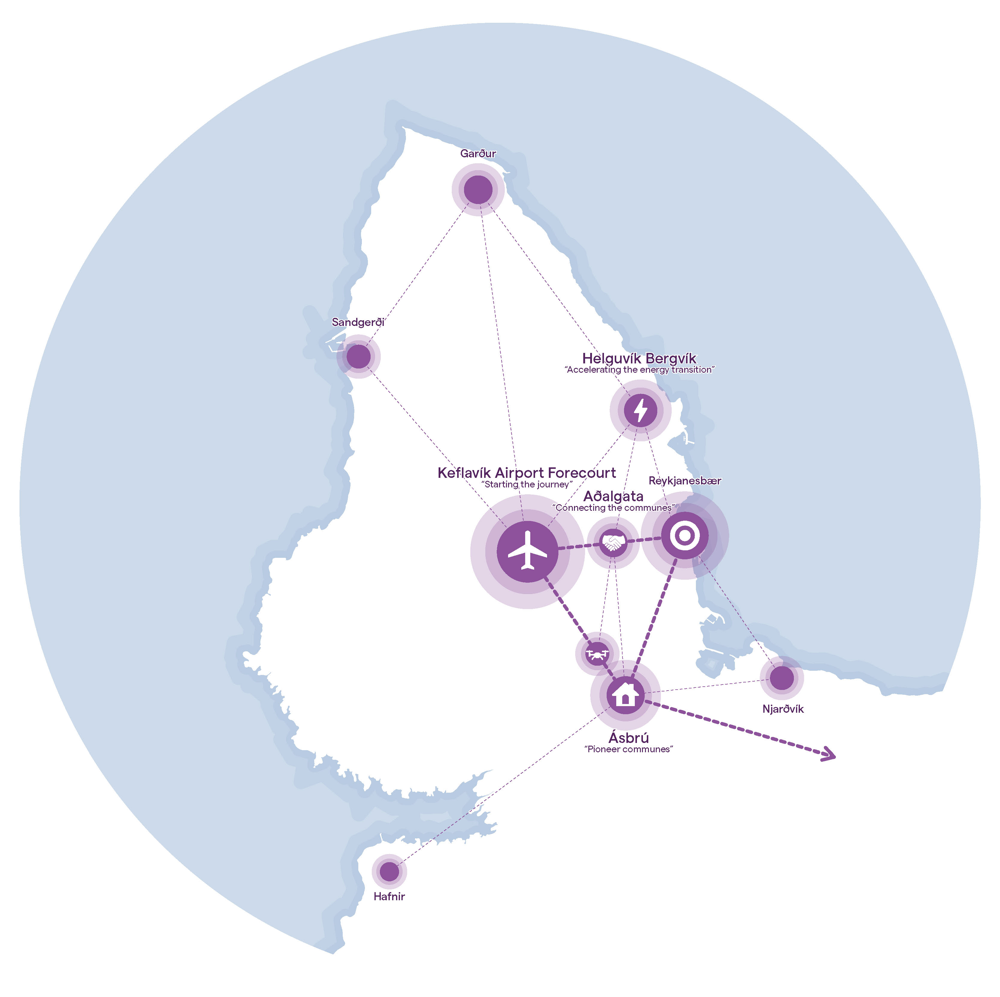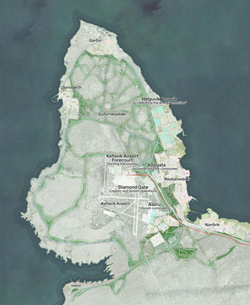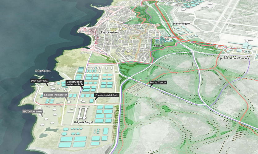 schaffen, die gemeinsame Nutzungen, Außenanlagen und Fahrradnetze ermöglichen. Belastbare Verkehrsnetze und ein erweitertes Angebot an öffentlichen Verkehrsmitteln, einschließlich eines halbinselweiten DRT-Angebots, verbessern die lokale Anbindung der städtischen Knotenpunkte. Eine Hochgeschwindigkeitsverbindung nach Reykjavík durch eine KRL-Linie bindet den Archipel in das Mobilitätssystem der Hauptstadt ein. Die Energiestrategie strebt eine Diversifizierung und Dekarbonisierung der lokalen Energiesysteme an, während gleichzeitig die wirtschaftliche Entwicklung durch innovative Lösungen mittel- bis langfristig gefördert wird. Diese räumlichen Strategien werden durch wirtschaftliche Strategien für Industrie, Wissen und Frachtentwicklung untermauert, um eine widerstandsfähige und vielfältige industrielle Basis zu schaffen, Geschäftsmöglichkeiten für umweltfreundliche und hochtechnologische Aktivitäten zu entwickeln und letztendlich einen international wettbewerbsfähigen Wirtschaftsstandort zu schaffen.