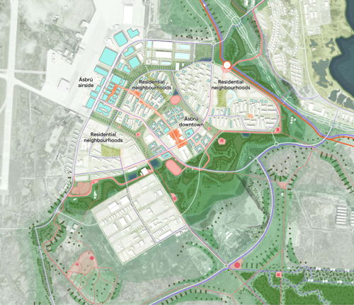 - Am südlichen Rand des Flughafens soll Ásbrú zu einem campusartigen Gebiet werden, in dem Luftfahrtaktivitäten und F&E, Start-up-Programme, Leichtindustrie und vor allem eine ehrgeizige Wohnverdichtung gefördert werden, die die ehemalige NATO-Siedlung in ein eigenständiges Viertel verwandelt, eine moderne Variante des gemütlichen, lebendigen Dorfes.