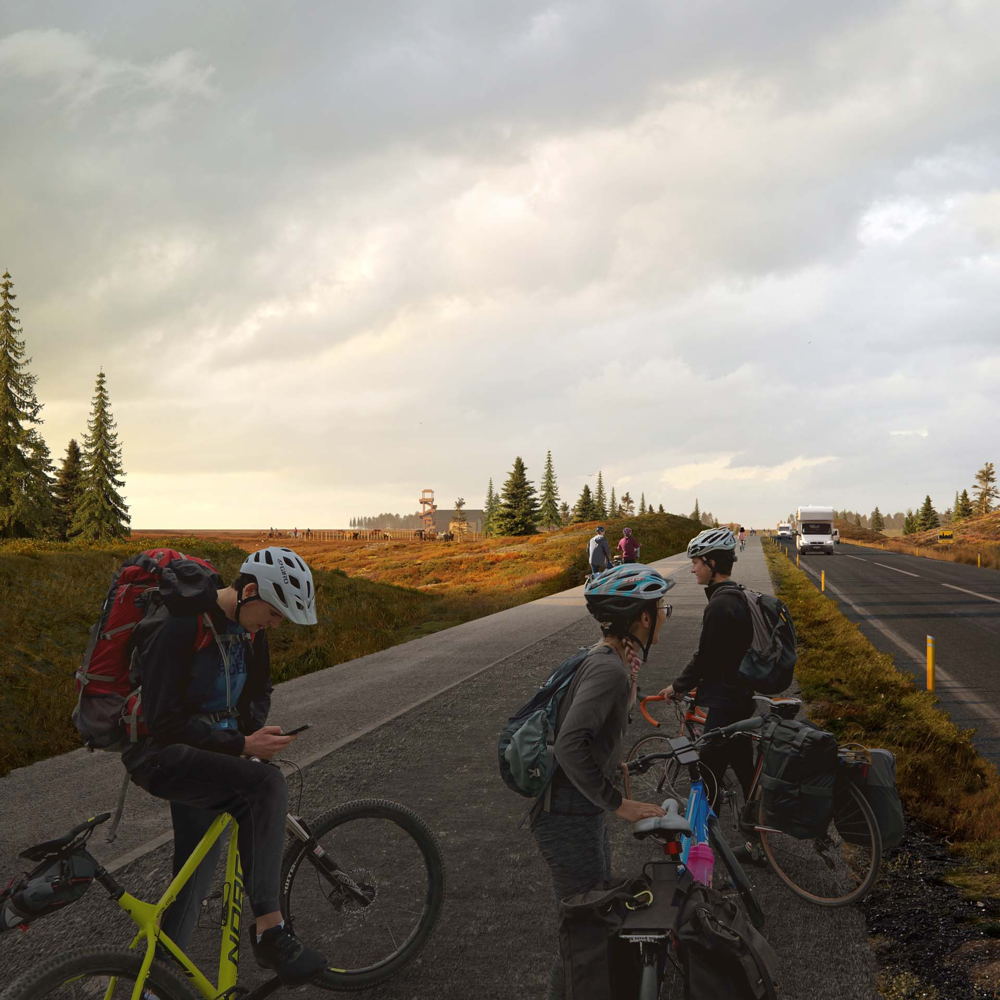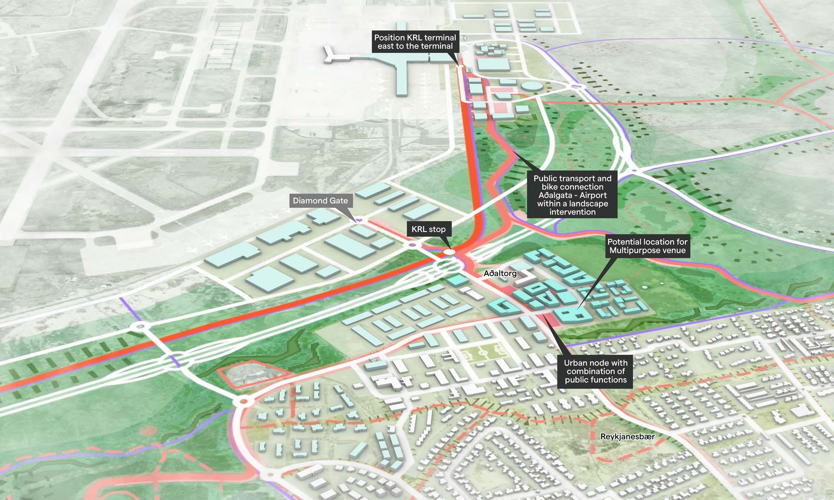 - Das treffend benannte „Gateway to Iceland“ ist ein einladender Weg, der von den Geschäfts- und Besuchereinrichtungen des Flughafenvorplatzes bis hin zum Aðalgata-Gebiet führt, einem Knotenpunkt, der den Eingang zur Stadt Reykjanesbær markiert. Zusammen mit dem angrenzenden Logistikzentrum Diamond Gate bildet Aðalgata einen äußerst dynamischen Stadtteil, in dem sich Wohn-, Gemeinschafts- und F&E-Programme vermischen.