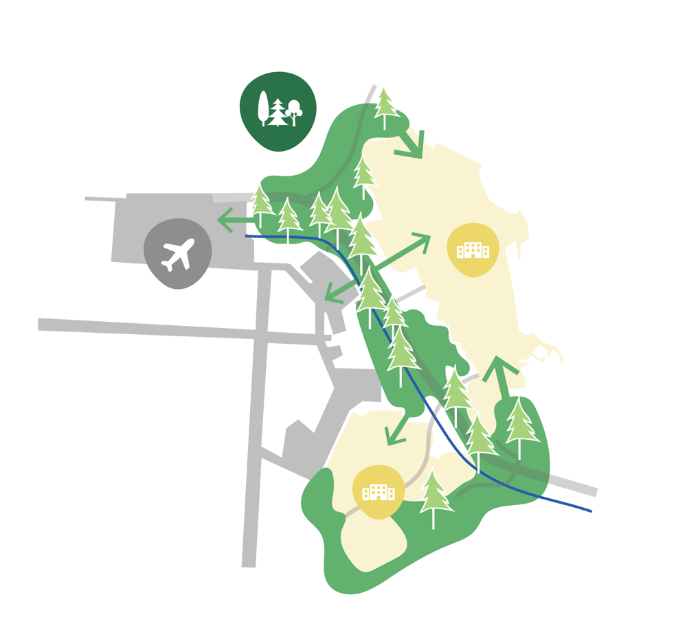 Um die K64-Initiative langfristig aufrechtzuerhalten, greifen Stadtgestaltung, Landschafts- und Mobilitätsstrategien in einem Ökosystem ineinander, das verbindet, schützt und aufwertet und gleichzeitig das Wirtschafts-, Bevölkerungs- und Beschäftigungswachstum unterstützt. Es fördert stärkere Synergien zwischen den wirtschaftlichen und sozialen Strukturen der Halbinsel. Der städtebauliche Rahmen verhindert die Zersiedelung, indem er eine kompakte Stadtentwicklung vorschlägt, die in der bestehenden Bebauung verankert ist. Es schafft eine eigene räumliche Logik für flughafenbezogene Tätigkeiten rund um den Flughafen, während es die Nutzungsmischung als Entwicklungsprinzip anstrebt.