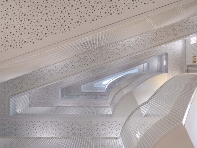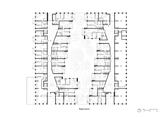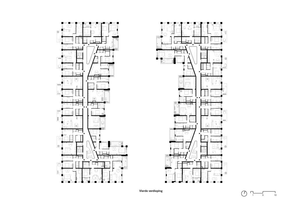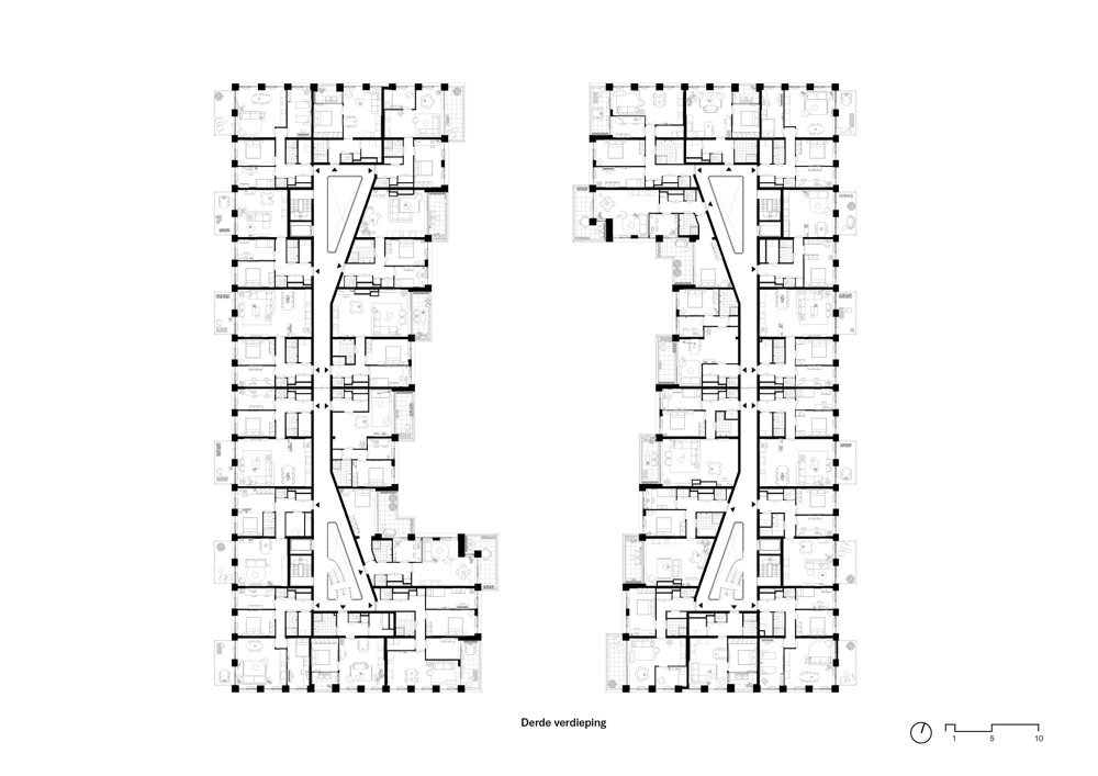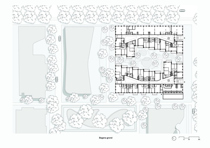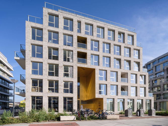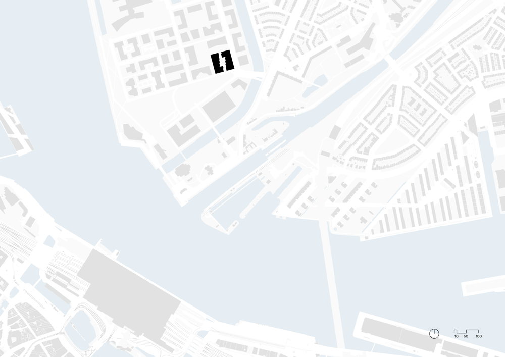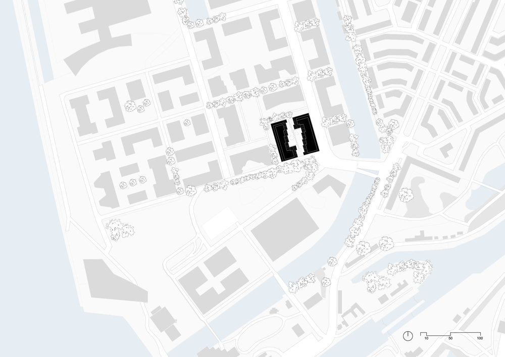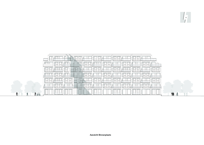 Programma: 546 m2, 149 appartementen met verschillende woningtypologieën, buitenruimtes, gestapelde binnentuin, 97 ondergrondse parkeerplaatsen en bergingen