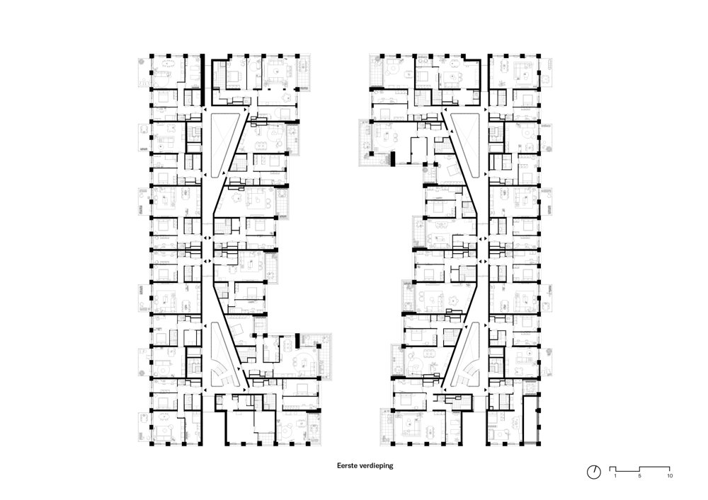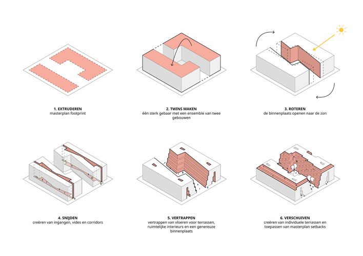 KCAP heeft ervoor gekozen om beide volumes te koppelen en naar elkaar toe te trekken - zowel in architectuur als in opzet. Hierdoor ontstonden twee zich in de knik verwijdende L-vormen; door daarbij de volumes naar onder te verbreden en naar boven te versmallen konden er in het interieur grote vides gemaakt worden, en ontstond de basis voor de kenmerkende getrapte gebouwvorm. "De twee gebouwen splitsen zich zorgvuldig rond de binnentuin; daar waar het zo mooi stapelt maken ze contact met elkaar; ook zorgt deze opzet voor meer contact tussen de bewoners. Met The Twins bouwen we namelijk meer dan alleen woningen, we bouwen een gemeenschap", aldus Irma van Oort, partner bij KCAP.