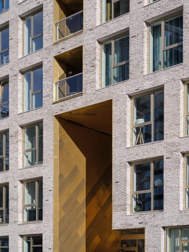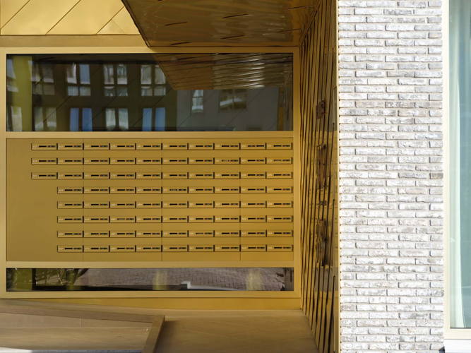 De hoge entrees liggen iets terug in de gevel, maar zijn transparant opgezet en doorlopend bekleed met goud geanodiseerd aluminium. Zo trekken ze langs de binnenzijde van de gevel het licht naar boven; door de goudkleurige gloed, de warm verlichte galerijen en de lichtinval van boven zijn de ruimtelijkheid en levendigheid van de binnenwereld ook van buiten voelbaar. De goudkleurige wandbekleding loopt door over de gehele entreeverdieping; ook de huisnummers en bellen zijn hierop afgestemd, wat het gevoel van luxe versterkt.