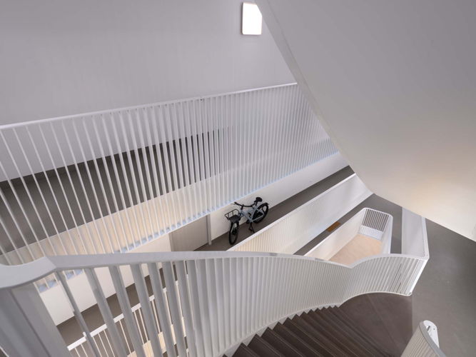 De open ruimte tussen de twee volumes is een essentieel onderdeel van het ontwerp. Rondom de gemeenschappelijke binnentuin, die is ontworpen door Buro Sant en Co, stapelen de verspringende balkons zich trapsgewijs op. Deze stapeling van buitenruimtes garandeert niet alleen zonlicht en privacy voor de bewoners: alle individuele balkons zijn voorzien van verticale groene wanden, die samen een doorlopende groene gevel vormen. Dit zorgt, samen met de binnentuin, voor een weelderige, vallei-achtige binnenwereld die uniek is voor The Twins.
